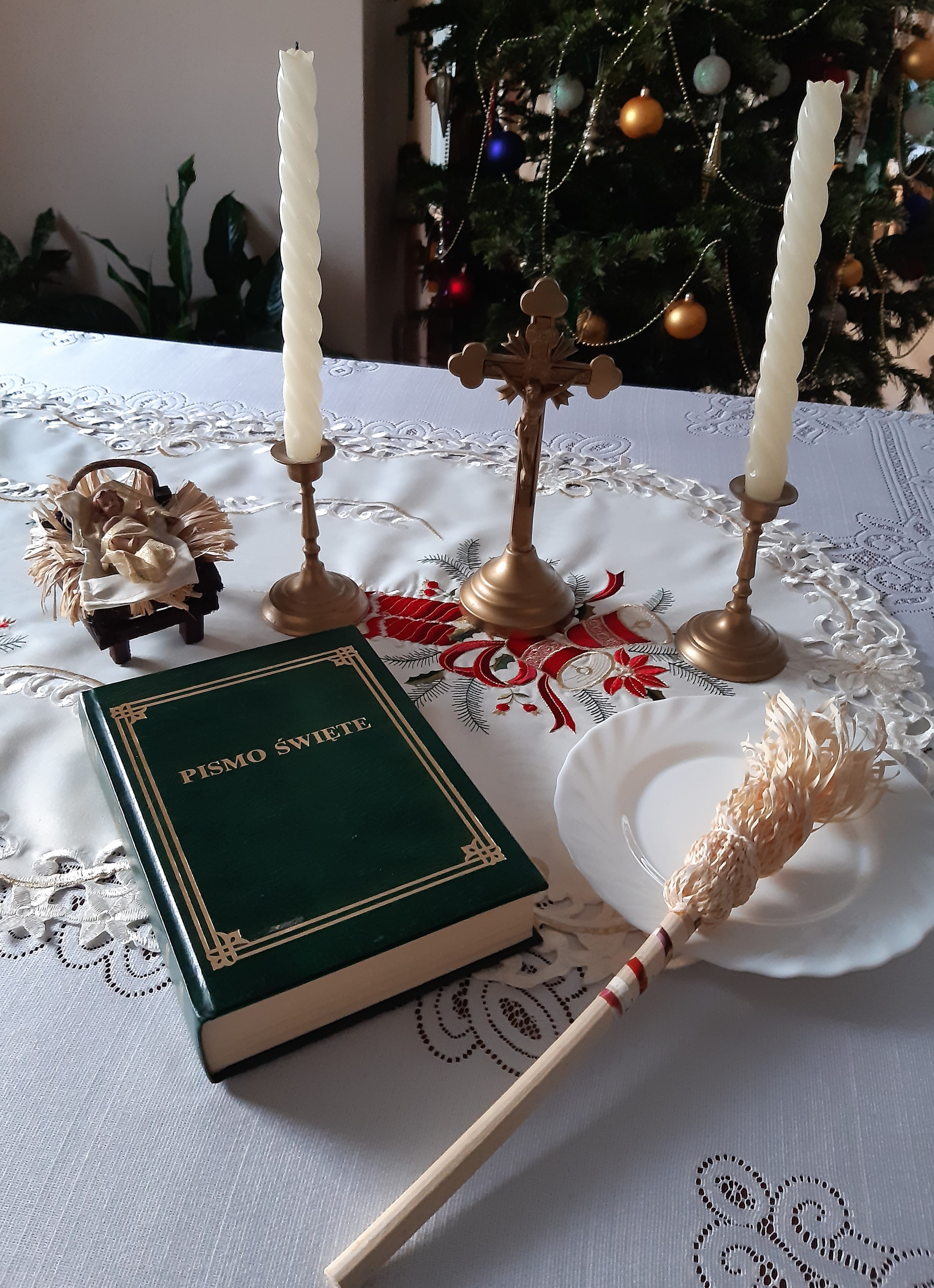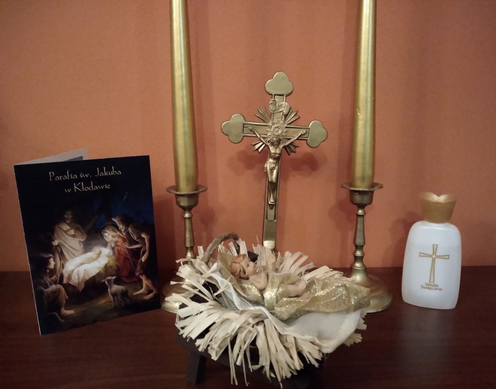 • Na stole postawić krucyfiks i dwie zapalone świece, wodę święconą i kropidło;