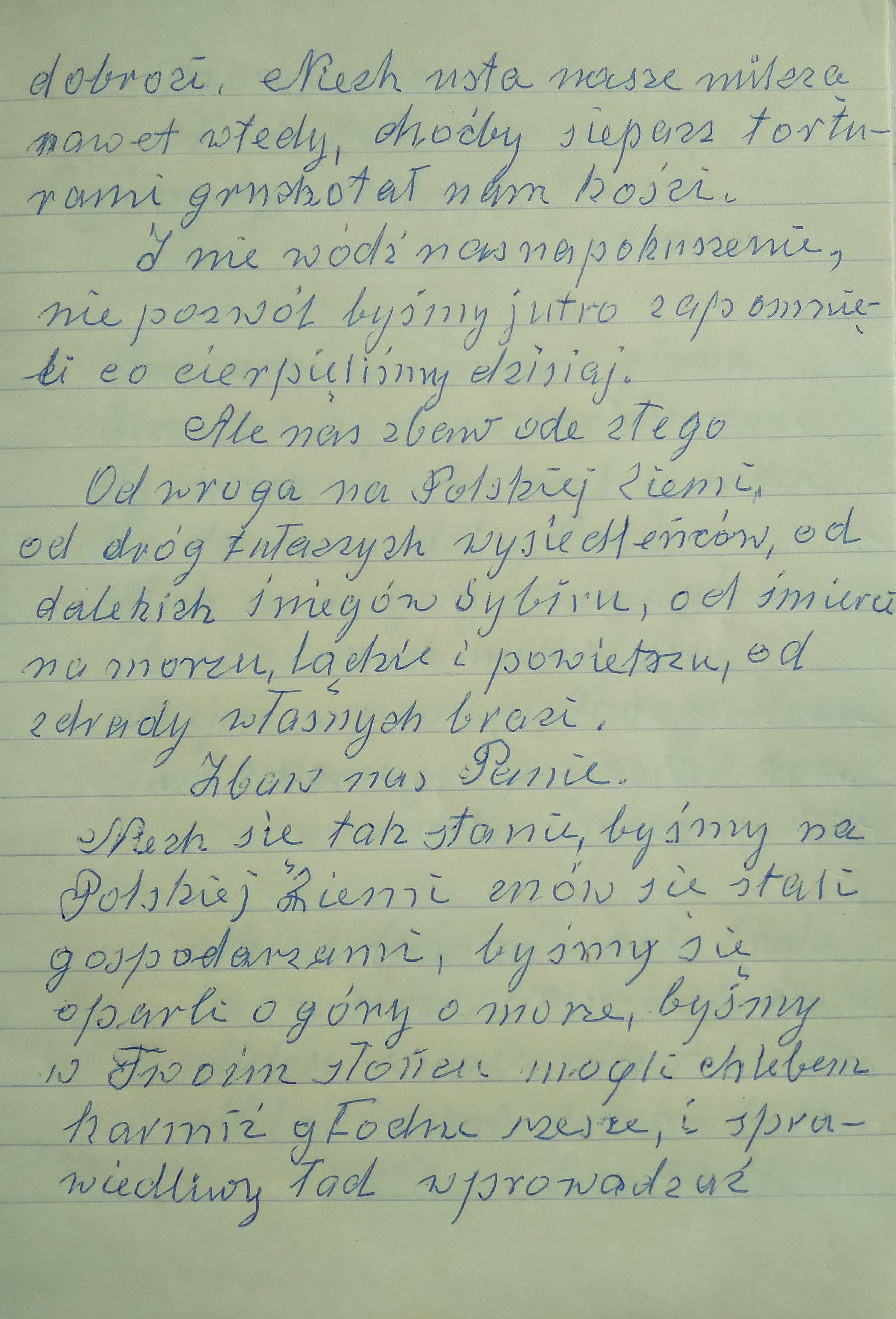 Ale nas zbaw od złego, od wroga na Polskiej ziemi, od dróg tułaczych wysiedleńców, od dalekich śniegów Sybiru, od śmierci na morzu, lądzie i powietrzu, od zdrady własnych braci.